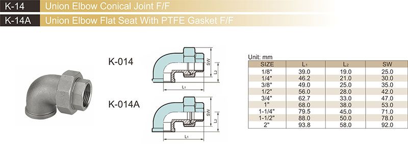 - K-014A Union Elbow Flat Seat With PTFE Gasket F/F
