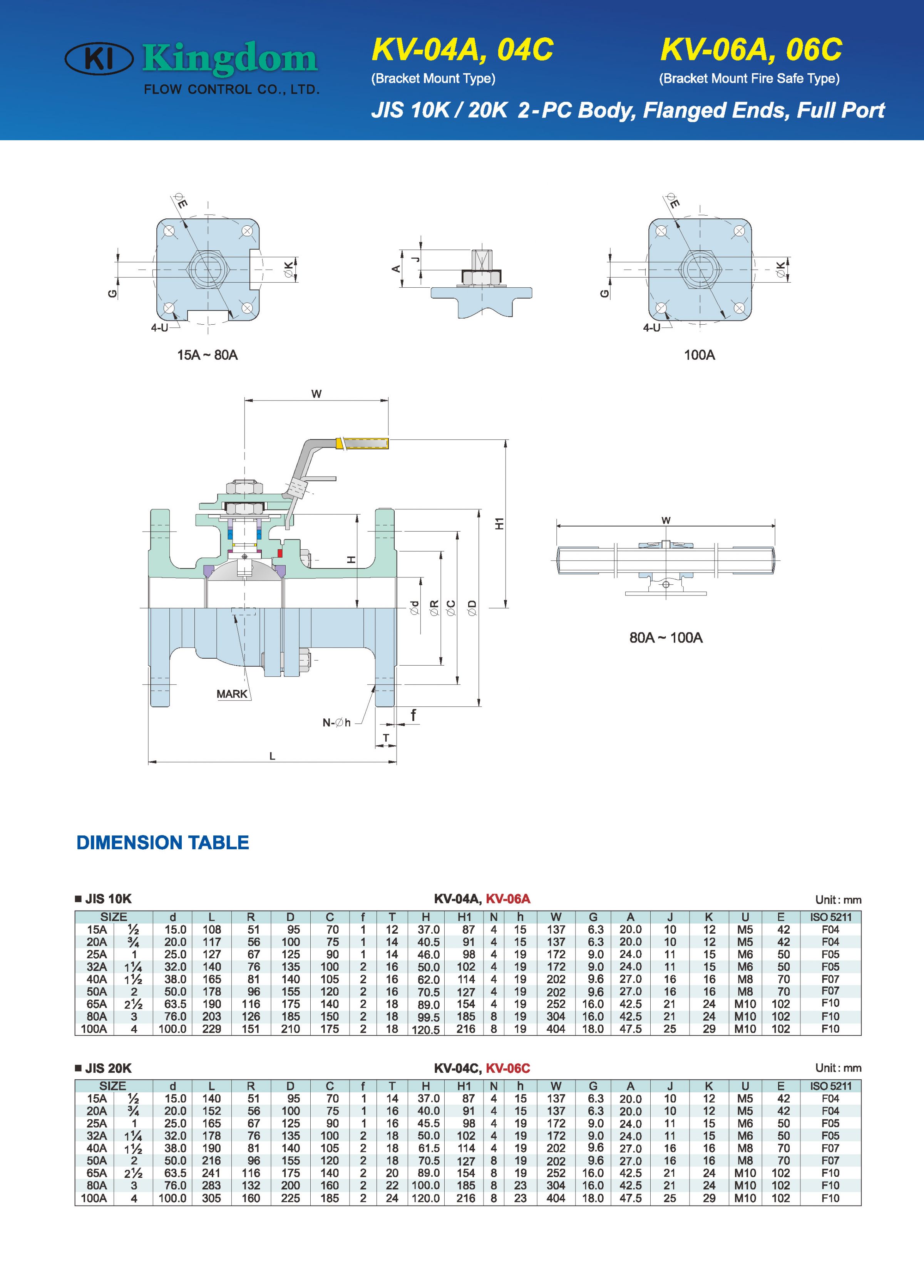 The KV-04A and 04C models are designed as Bracket Mount Types, while the KV-06A and 06C models incorporate both Bracket Mount design and Fire Safe features. These valves adhere to JIS 10K and 20K standards and are built with a 2-piece body, flanged ends, and a full port for enhanced flow capacity.
