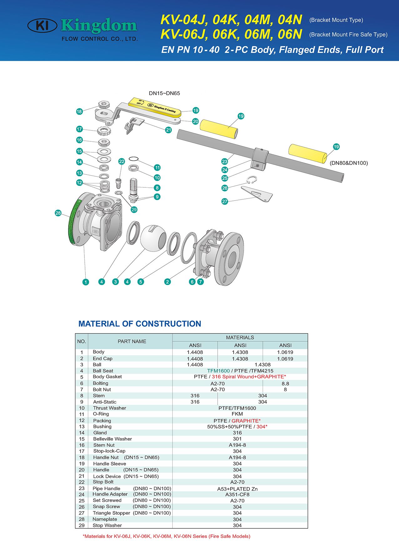 The KV-04J, 04K, 04M, and 04N models are designed as Bracket Mount Types, while the KV-L6J, 06K, 06M, and 06N models feature both Bracket Mount design and Fire Safe capabilities. These valves comply with EN PN 10-40 standards and are constructed with a 2-piece body, flanged ends, and a full port for optimal flow.