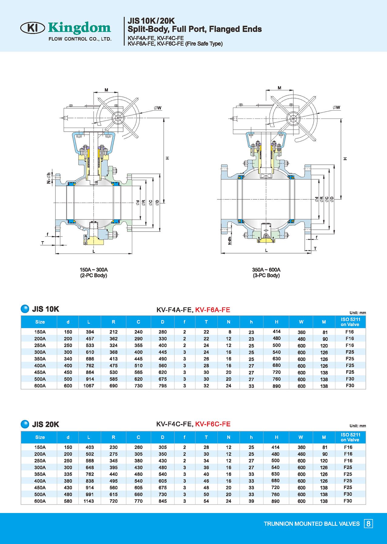 The KV-F4A and KV-F4C models, along with the KV-F6A and KV-F6C models, are fire-safe type valves designed with a split body, full port configuration, and flanged ends, ensuring both safety and efficient flow management in various applications.