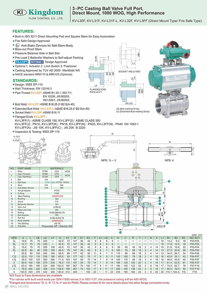 The KV-L30F, KV-L31F, KV-L32F, and KV-L3FF models are 3-piece casting ball valves featuring a full port design. They come with a mounting pad and are rated for 1000 WOG, ensuring high performance across various applications and comply with fire safe standards.