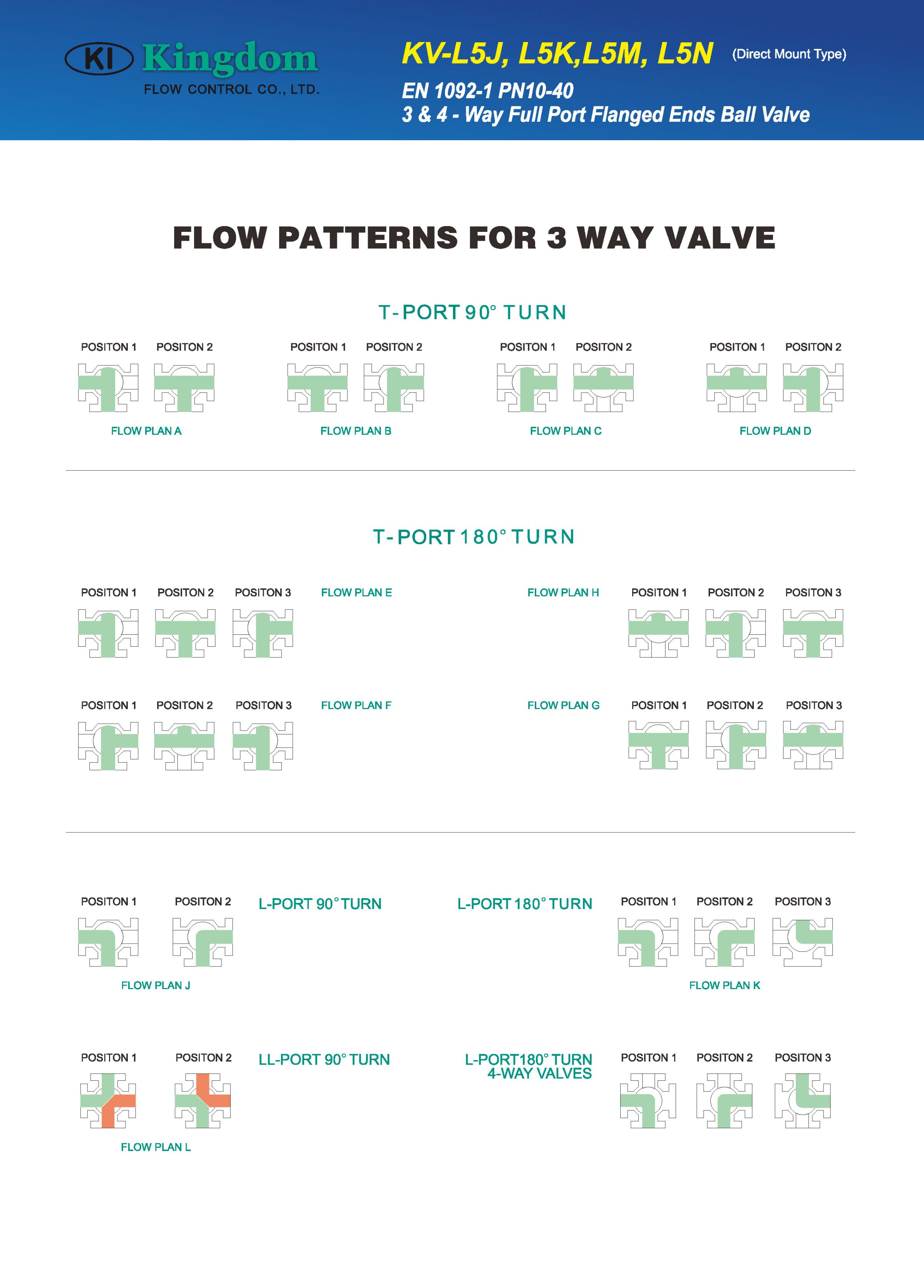 The KV-L5K and KV-L5N models are full port, flanged end ball valves designed for 3-way and 4-way configurations, providing efficient flow management and versatility in various applications.