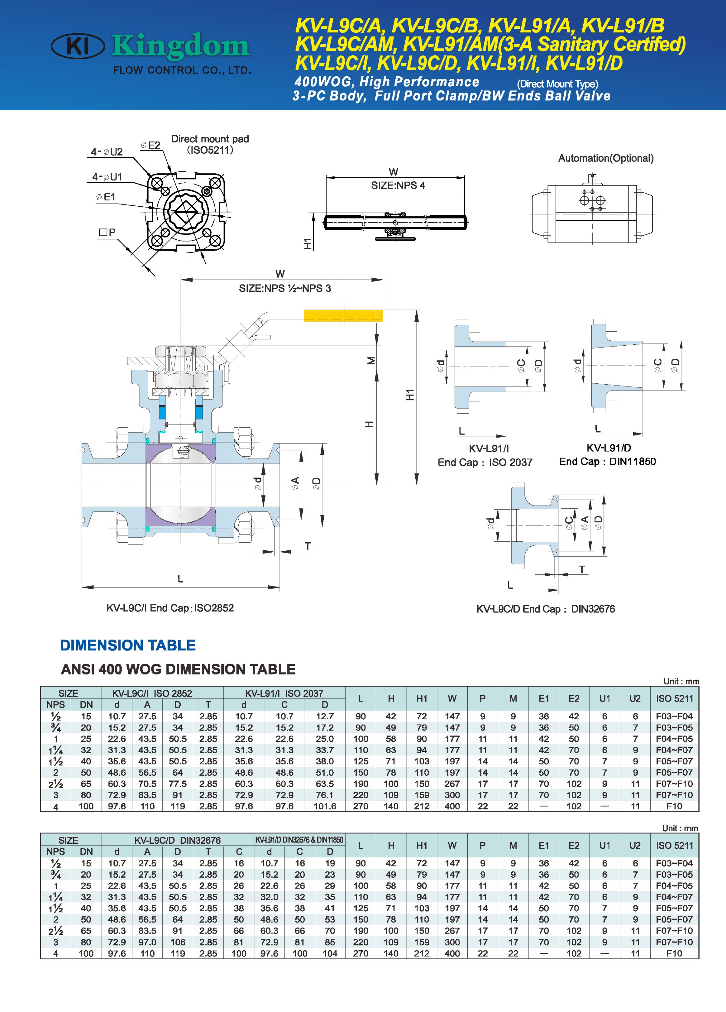 The KV-L9C/I, L9C/B, L91/I, L91/B, L9C/A, and L91/A models are full port valves with a pressure rating of 400 WOG. They come with BW (Butt Weld) or clamp ends, ensuring versatility for various applications.