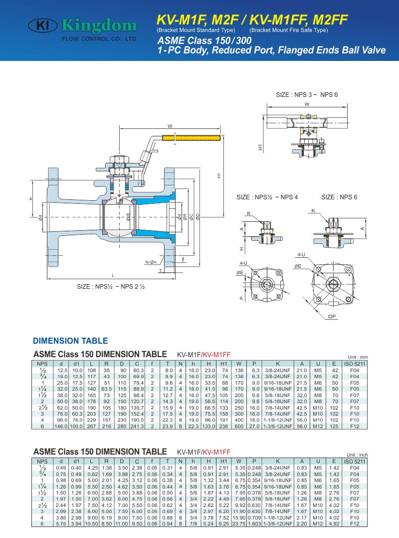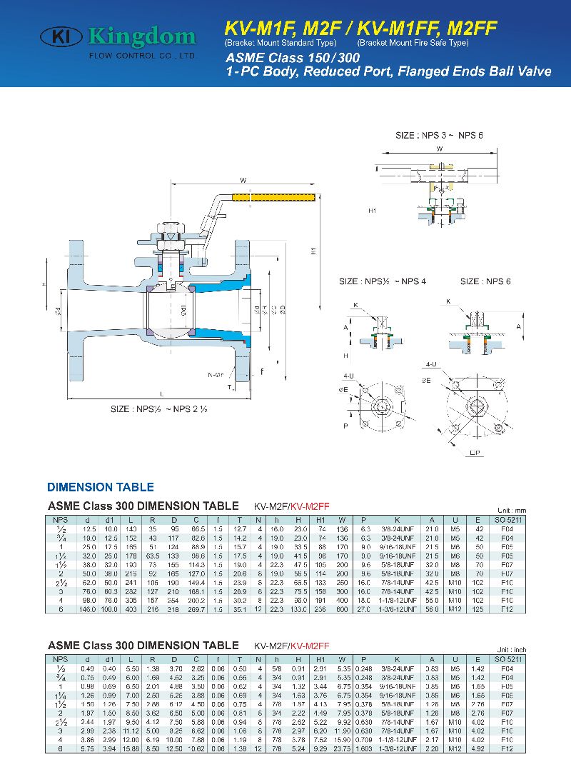 KV-M1F and KV-M1FF (Fire Safe Type) are 1-PC body structure flanged ball valves designed according to ASME Class 150 standards, featuring a reduced port design.