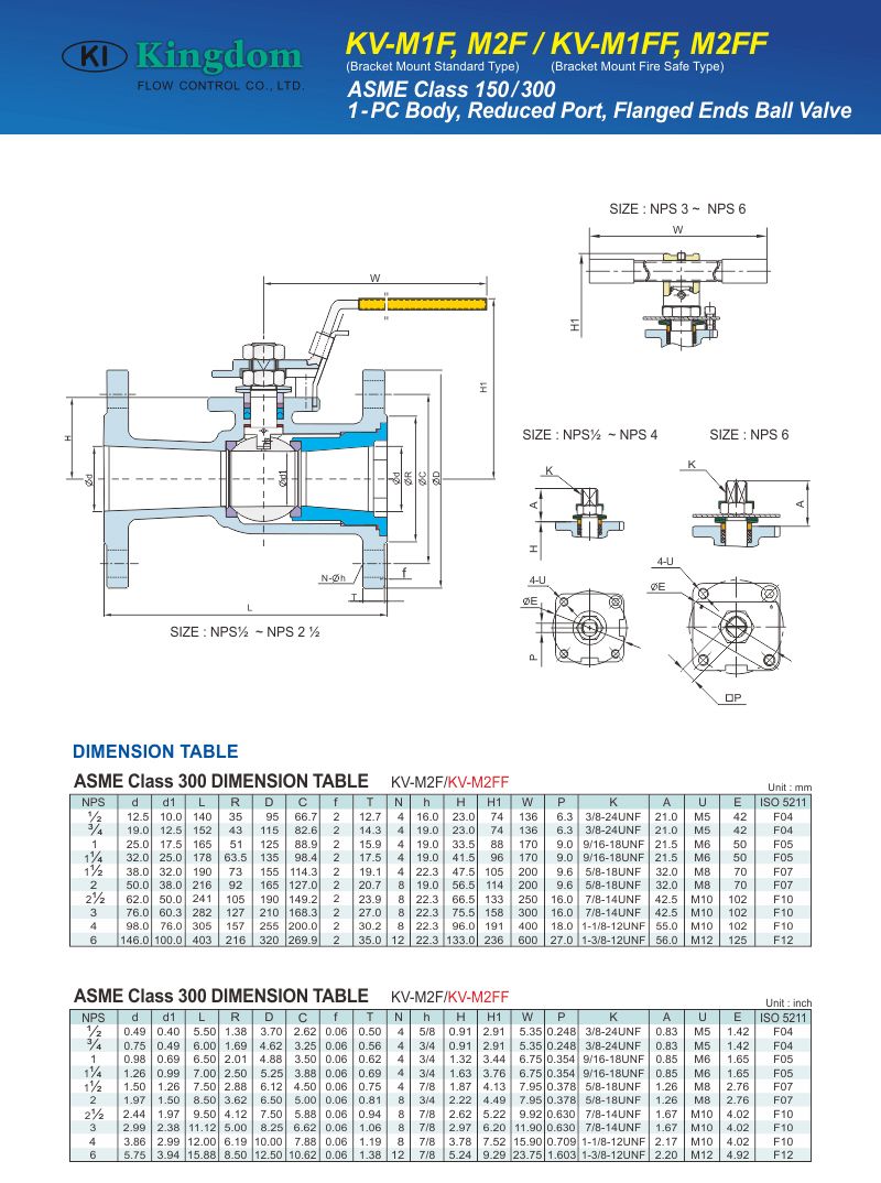 KV-M2F and KV-M2FF are ASME Class 300, 1-PC body flanged ball valves with reduced port, featuring bracket mount type and fire safe type options.