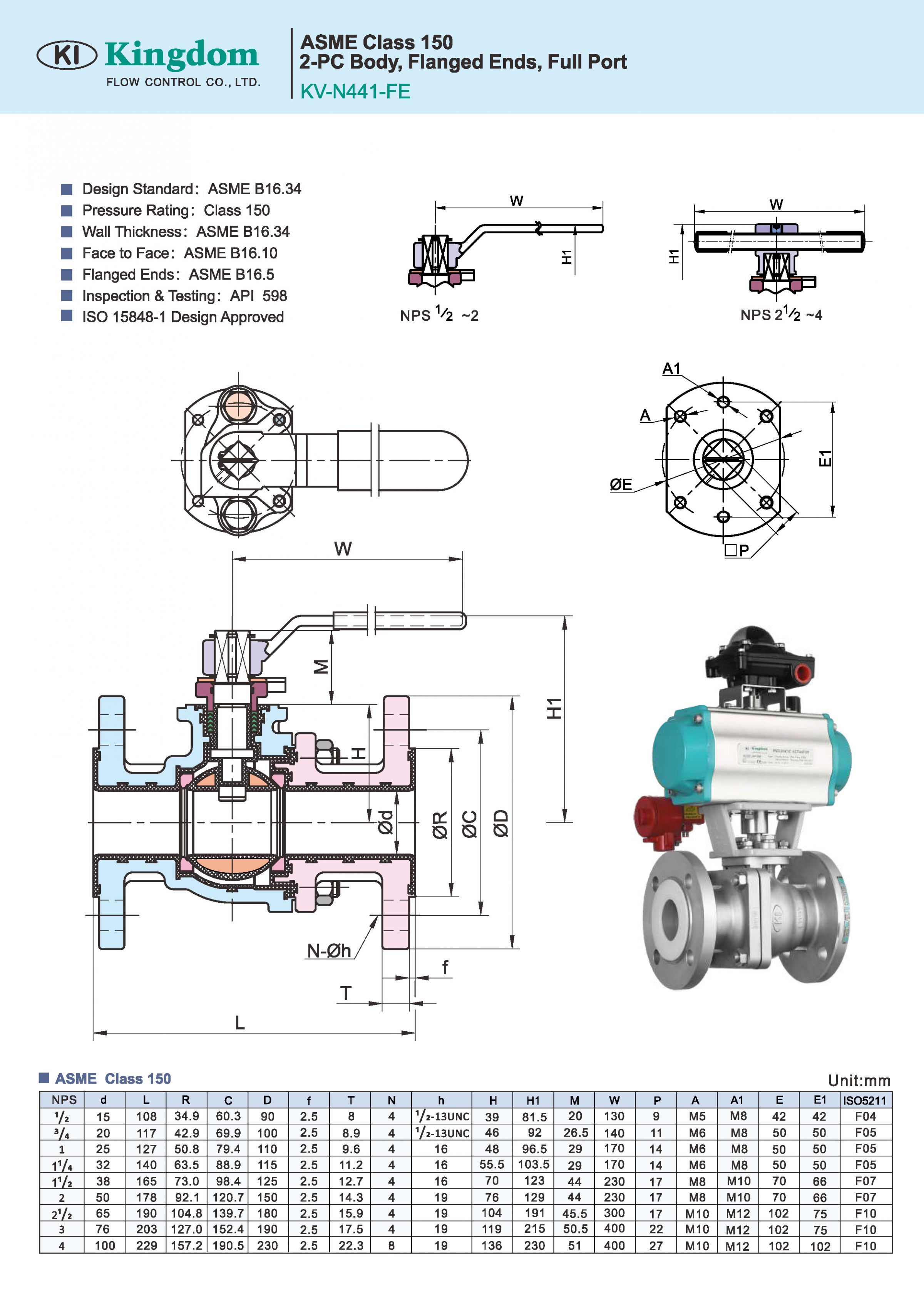 The KV-N441-FE model is designed for ASME Class 150 applications, featuring a 2-piece body construction, flanged ends, and a full port configuration, ensuring optimal flow control and durability.