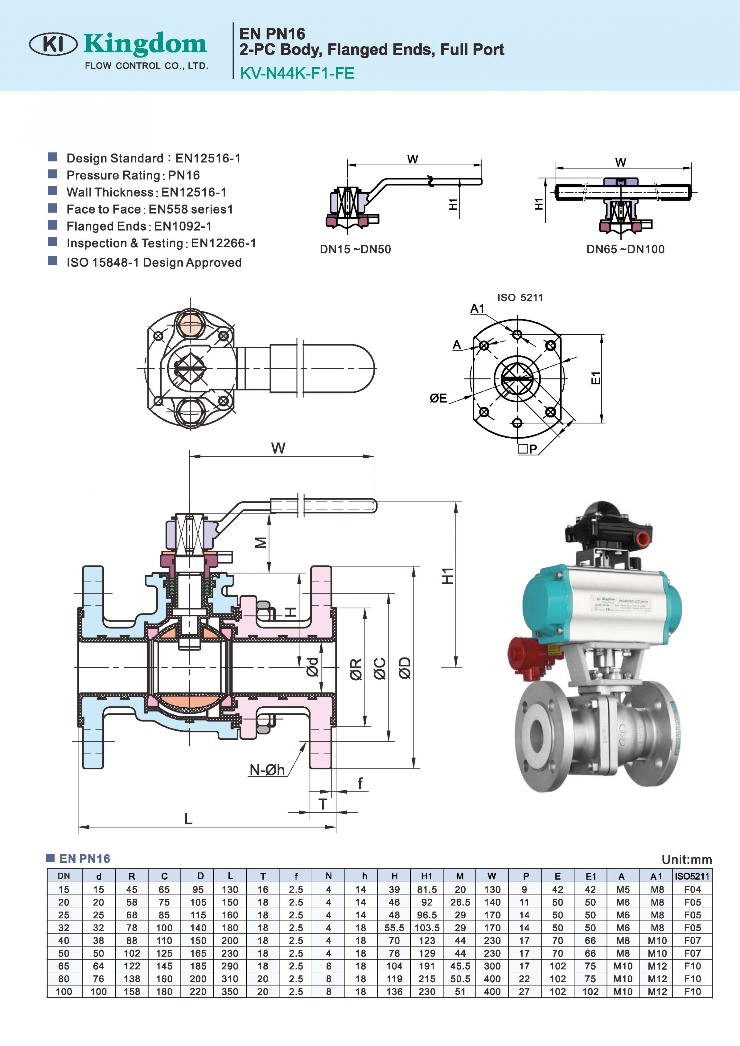The KV-N44K-F1-FE model is designed for EN PN 16 applications, featuring a 2-piece body construction, flanged ends, and a full port configuration, ensuring reliable performance and efficient flow management.