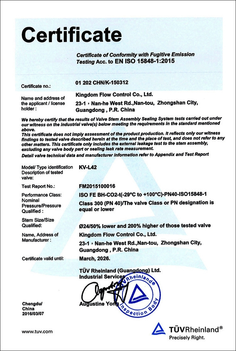 - ISO 15848-1: ISO 15848-1 is considered one of the most demanding fugitive emission test standards for industrial valves. Valves certified by this standard is suitable for severe requirements on low emission. A wide range of KI soft and metal seated ball valves are approved by ISO 15848-1.