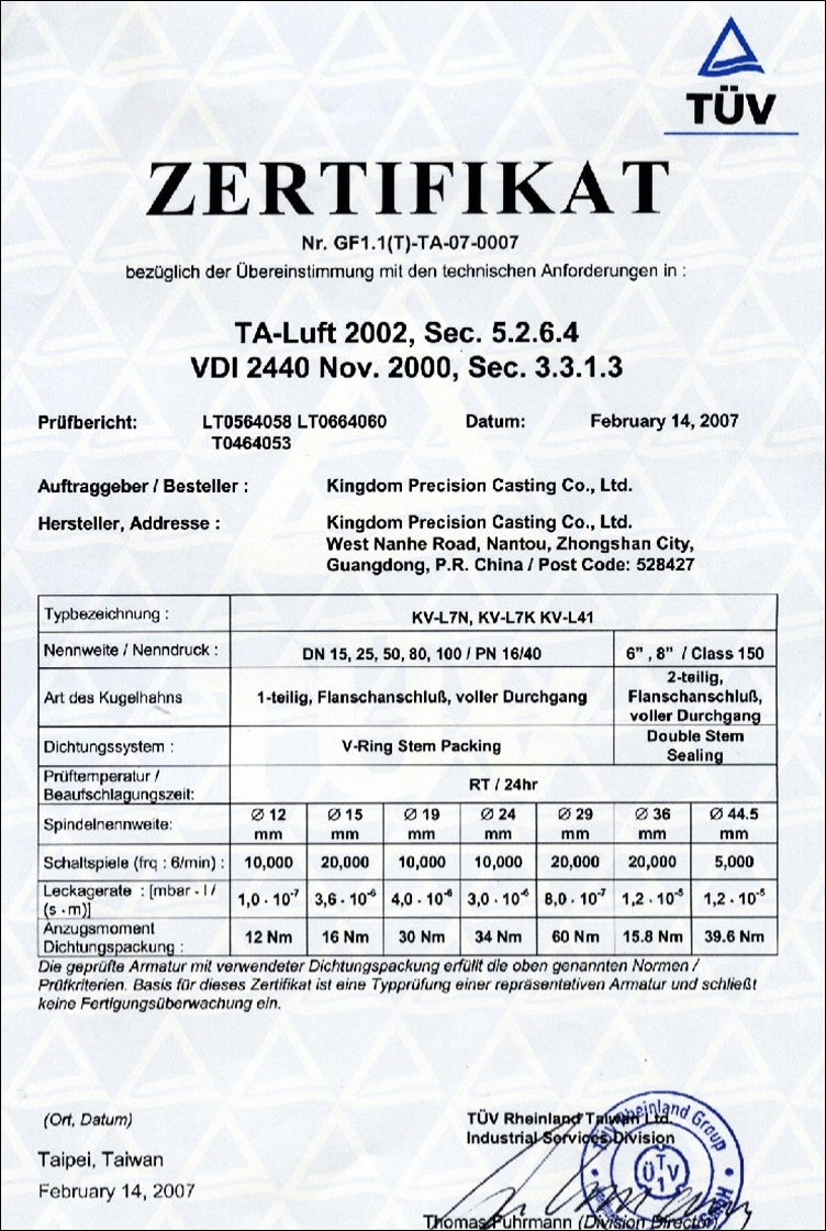 - TA-Luft: TA-Luft regulation specifies the stem sealing performance on valves and has widely applied in European process industries. A broad range of KI valves passed the TA-Luft low-emission requirements.