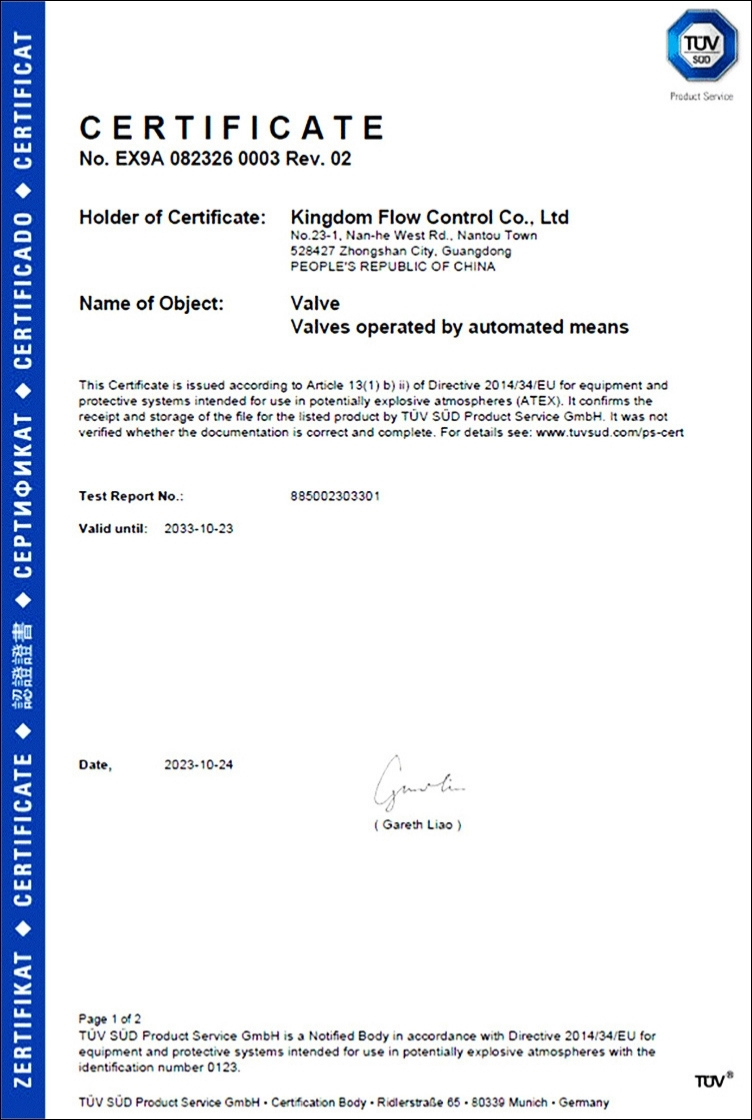 - ATEX: The ATEX directive 2014/34/EU covers equipment and protective systems intended for use in potentially explosive atmospheres. KI valves and pneumatic actuators are certified against group II category 2.