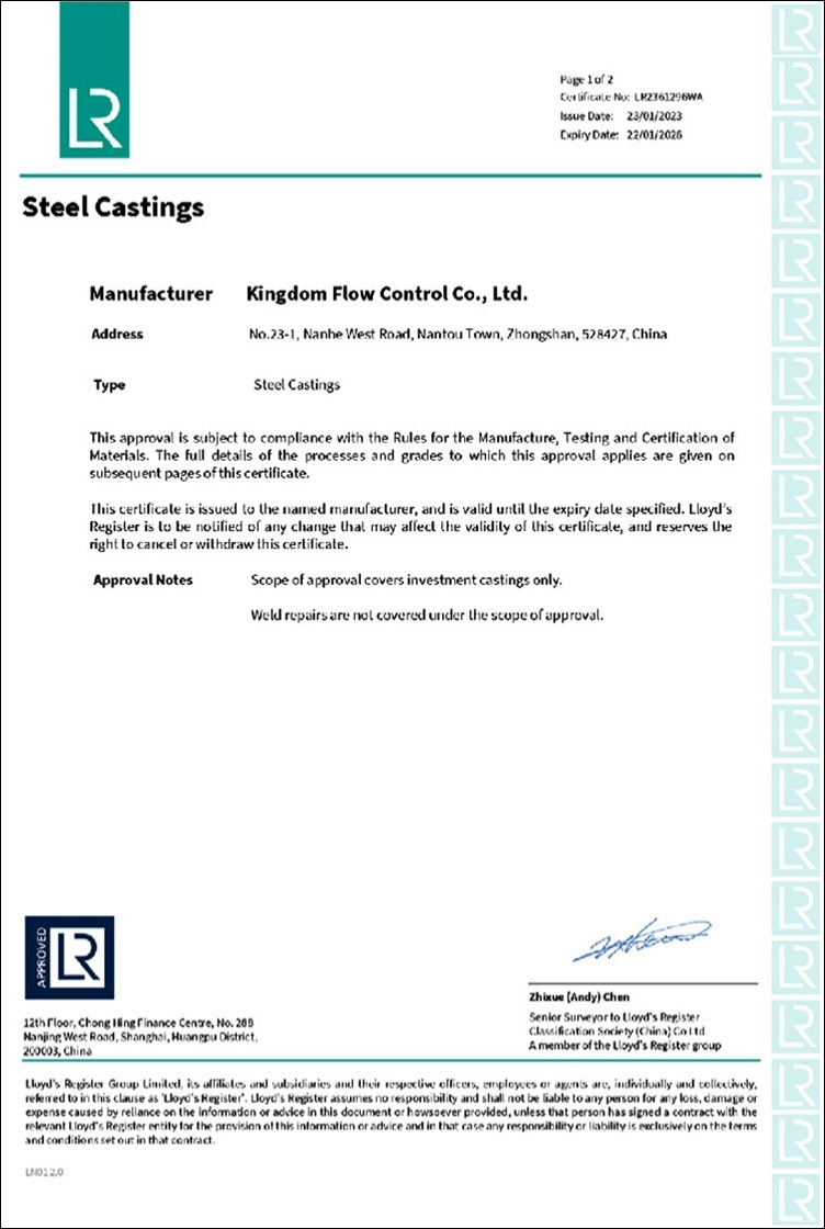 - LR: KI is approved as a manufacturer in accordance with the requirements of Lloyd's Register for castings in carbon, carbon-manganese and austenitic stainless steel.