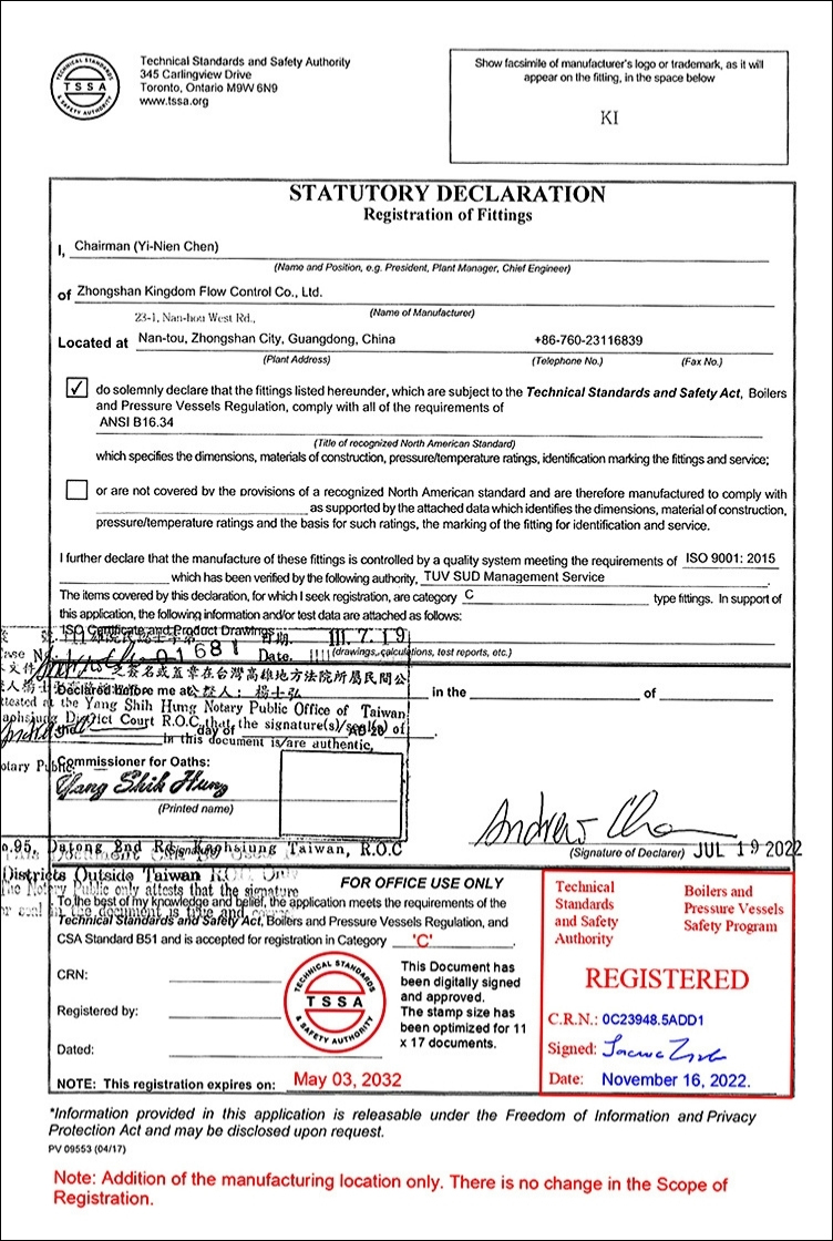 - CRN: KI has registered its valves and fittings for Canadian market of all applicable provinces.