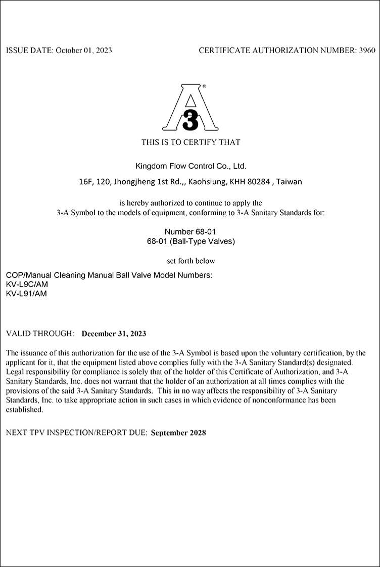 - 3-A Sanitary certified: KI Sanitary Ball Valves passed the 3-A Sanitary Standard(s) and the issuance of this authorization for the use of the 3-A Symbol.