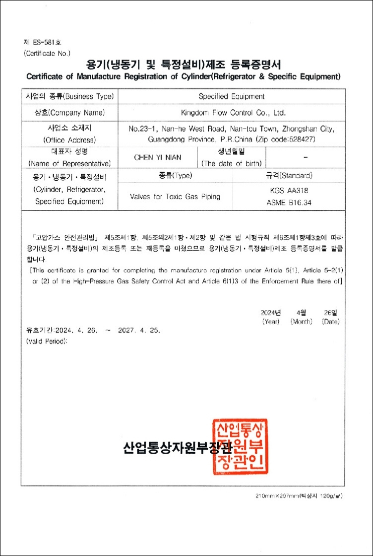- KGS-AA318: KGS AA318 is a standard that addresses the facilities, technology, and inspection criteria for manufacturing valves used in toxic gas pipelines.