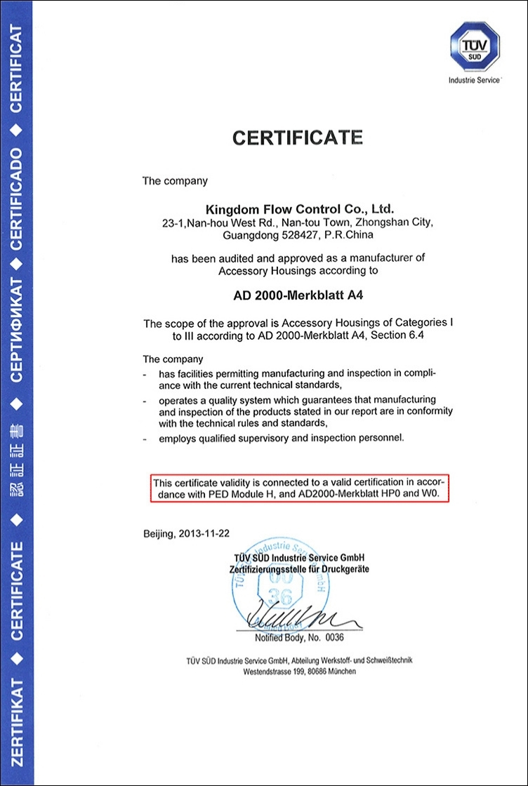 - AD 2000 A4: AD 2000-A4 is the specification for equipment, installation and marking of pressure vessels for accessory housings. It covers the scope of the PED module H, AD 2000-HP0 and AD-2000 W0. AD 2000-A4 certificate is granted when KI received these three certifications.