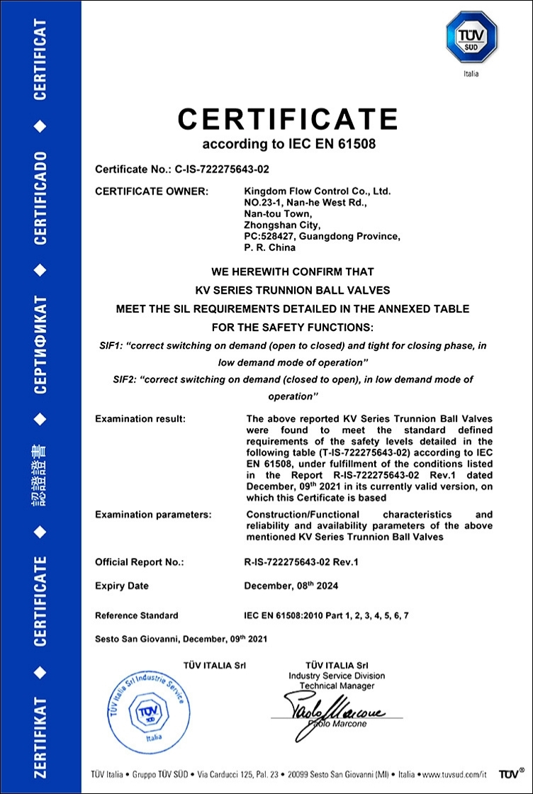 - SIL: Certified by SIL means the design, engineering and testing of the products are fully compliance with IEC 61508 and IEC 61511 standards and are suitable for use in a safety instrumented system. KI valves are SIL 3 certified.