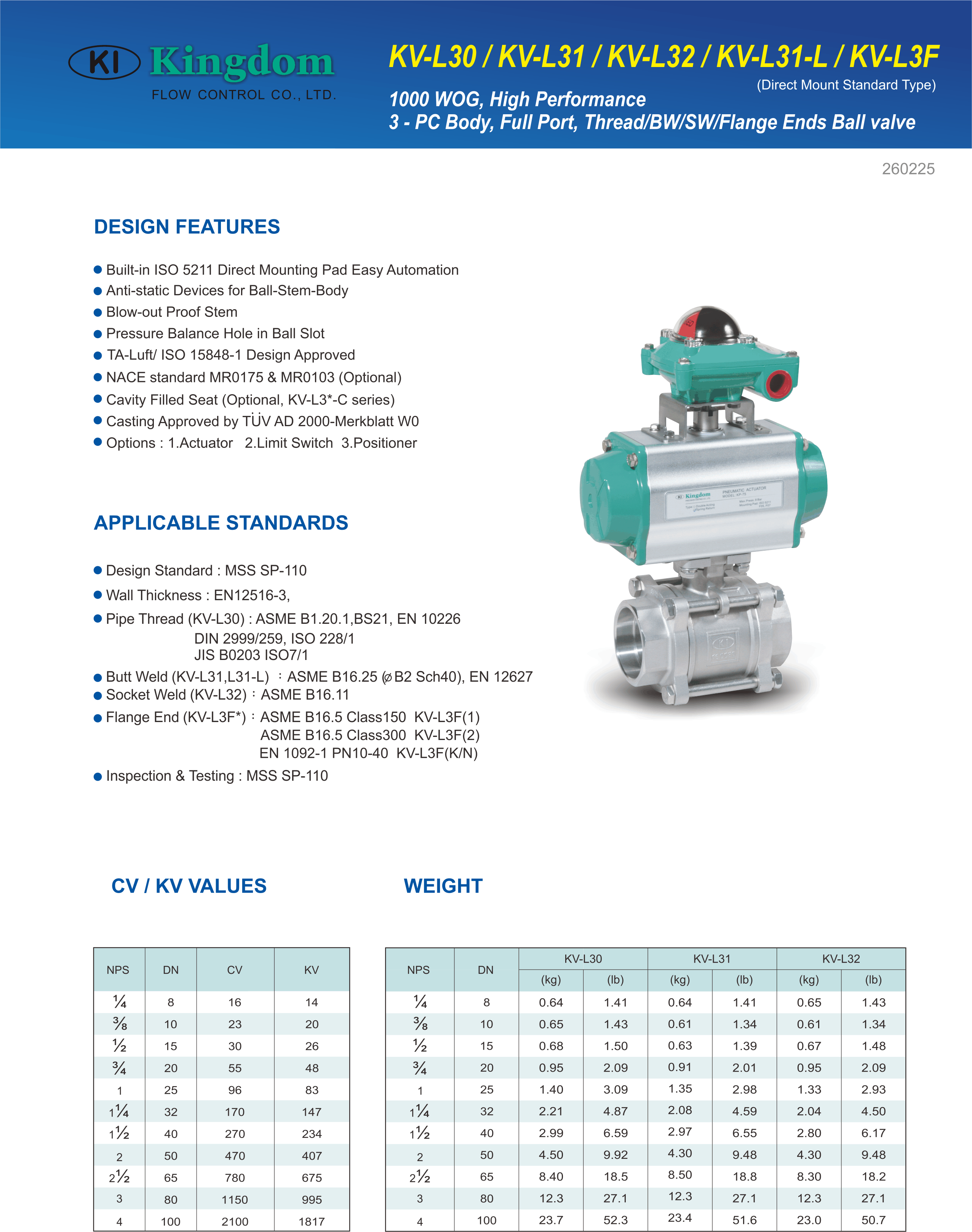 KV-L30,KV-L31,KV-L32,KV-L3F 3-PC Casting Ball Valve Full Port, Direct Mount, 1000 WOG, High Performance